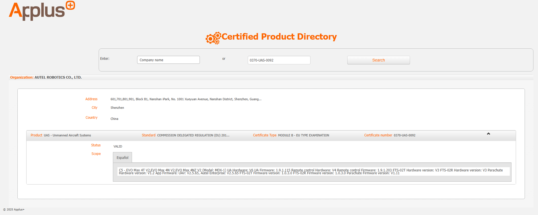 In undertaking the rigorous demands to meet the C5 Class requirements, Autel Robotics worked with Applus+, an independent and officially designated Notified Body. Applus+ carried out conformity assessments confirming that the EVO Max Series V2 meets all C5 Class requirements, enabling Autel Robotics to affix the C5 Class Mark.